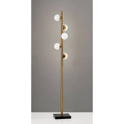 he Doppler LED Tree Lamp has mid-century modern inspiration. Five white opal glass globe shades are scattered along an antique brass pole. A square black marble base serves as a decorative accent as well as a heavy weight to keep this lamp sturdy and safe. This floor lamp ships with five G9 replaceable LED bulbs that give off a total of 1,000 lumens of warm, ambient lighting. The sleek look is finished off with a black fabric covered cord. Bulbs are included. This lamp is smart outler compatible.