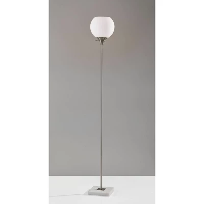 A simple silhouette is updated with high quality materials with the Fiona Torchiere. A square, white marble base keeps the lamp sturdy and strong while adding elegance to the look. A brushed steel finish is softened with a globe shaped opal glass shade that lights up with a warm, room filling glow. A 3-way rotary switch is located on the socket. A clear, barely there cord trails neatly from the base.
