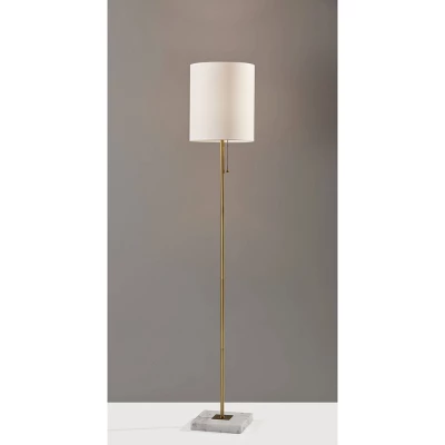 A simple silhouette is updated with high quality materials with the Fiona Floor Lamp. A square, white marble base keeps the lamp sturdy and strong while adding elegance to the look. Antique brass metal is softened with a white fabric shade that reveals its beautiful subtle texture when lit. Turn the lamp on and off with a simple tug of the pull chain switch. A clear, barely there cord trails neatly from the base.