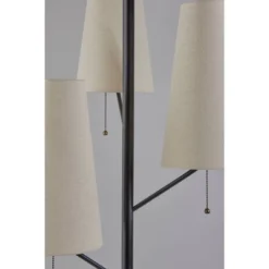 - The antique brass finish of the base, white cord, and beige trim offer a neutral color palette.