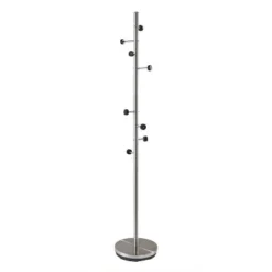 A multi-function accessory that looks good, the Quatro umbrella stand and coat rack takes up minimal space for dorm, office, bedroom, or entry hall. The matte champagne coated steel and chrome accents create a unique contrast. A metal cup at the base catches water from dripping umbrellas. This coat rack measures 67.5″ high and sits on top a 12″ diameter weighted base. The sturdy design can hold up to 50 lbs. The Quatro features 8 total hooks with a 10″ round umbrella stand and is easy to assemble.